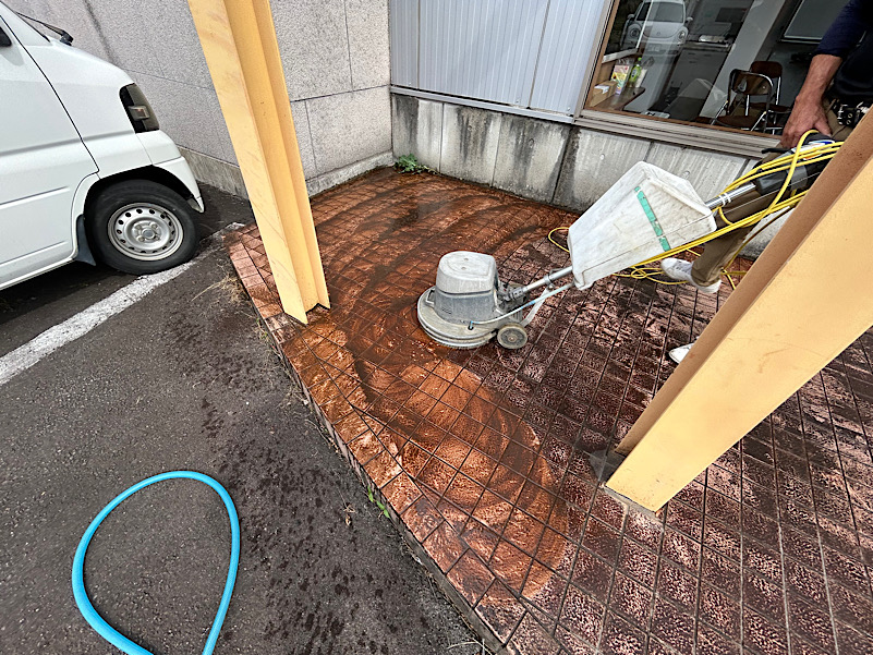 2. ポリッシャー洗浄:専用の機械(ポリッシャー)とブラシを使用し、タイルの凹凸や目地に入り込んだ汚れを物理的に擦り洗いします。